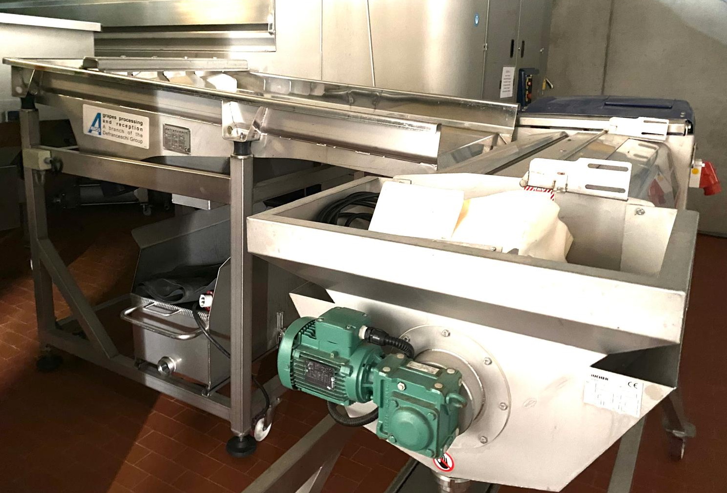 Arbeitsweise von X-Tri 100: Die aus den Entrappern kommenden Trauben werden auf dem vibrierenden Band verteilt und zum Band mit optischen Einheit gebracht. Der optische Sensor erkennt die verschiedenen Defekte (Blätter, Stiele, Insekten und Fremdkörper) und wirft sie mit einem Luftstrom aus. Das saubere Produkt wird direkt in die Zerkleinerungseinheit zur Weiterverarbeitung gebracht. Das optische System erkennt auch unreife Trauben (von unterschiedlicher Farbe), die zusammen mit den anderen Mängeln entfernt werden können. Die zu entfernenden Mängel können über den Touchscreen eingestellt werden. Die Linie X-Tri 100 kann bis zu 10 t/h Trauben verarbeiten. Die Leistung hängt von vielen Faktoren ab, z. B. von der Traubensorte, dem Reifegrad, der Menge der Mängel usw.